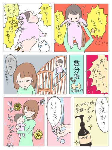 おむつ替えが大変になった 寝返りをするようになってから、おむつ替えがとっても大変になってきました。 最近は、つかまり立ちで鍛えた足腰の力のお陰か、寝返りのパワーが格段にアップ! おむつを替えたい私と寝返りをしたい娘の戦いの後は、もう、ぐったり…