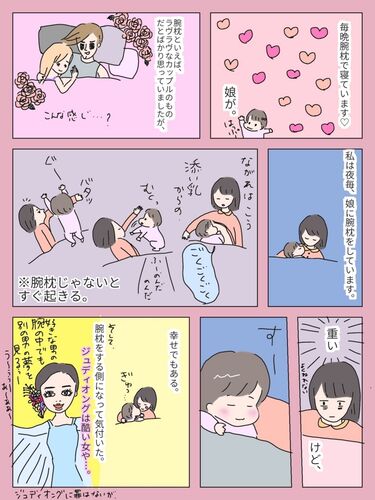 毎晩腕枕で寝ているんですよ♡ 娘が。 腕枕で眠る娘 腕枕って腕が痺れるんですね。 重いし、動けない。よって肩が凝る。 でも、腕枕をしてあげると安心するのか、寝付きも良いですし、よく寝てくれます。 それに、何より腕の中で眠る娘を見ると、じわじわと幸…
