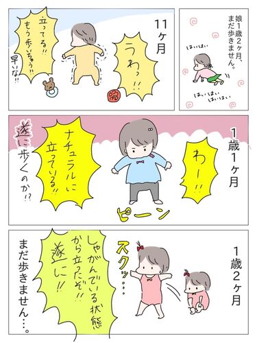 まだ歩きません。 思わせぶりなあなた。 歩かないよね〜。 ずっと成長が早かった娘 娘は、首すわりもお座りもつかまり立ちも、今まで全てが平均よりもかなり早い子でした。 歯が生えるのさえも早かったために、きっと歩くのも早いのだろうと予測していました…